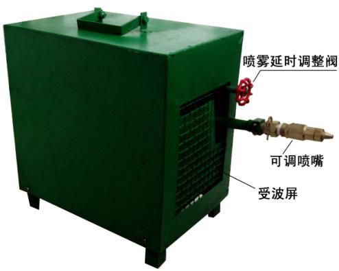 本裝置設(shè)計為一體化,有進(jìn)水閥門、噴霧時間調(diào)整閥門等組成,當(dāng)迎頭放炮時震動沖擊波沖擊機械放炮噴霧裝置的受波屏,進(jìn)水閥門打開,開始噴霧,同時水源又給進(jìn)水延時水箱注水,由于延時水箱與所配墜鐵比重偏移,水箱的水滿后,水箱逐漸傾斜并緩慢放水,從而逐漸減少噴霧延時時間,水箱的水流盡后,噴霧停止,直至下一次放炮,再次循環(huán)實現(xiàn)噴霧過程。噴霧延時水箱有進(jìn)水調(diào)整閥門,調(diào)整此閥門可調(diào)整噴霧時間。